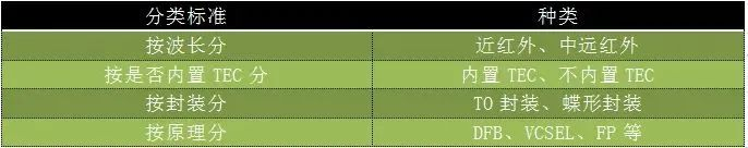 激光光源根據原理分主要有DFB、VCSEL、FP等幾種;按照波長分為近紅外和中遠紅外激光器;按照是否內置TEC分為內置TEC和無內置TEC兩種;按照封裝可分為TO封裝和蝶形封裝等。一般蝶形封裝都內置了TEC和熱敏電阻。